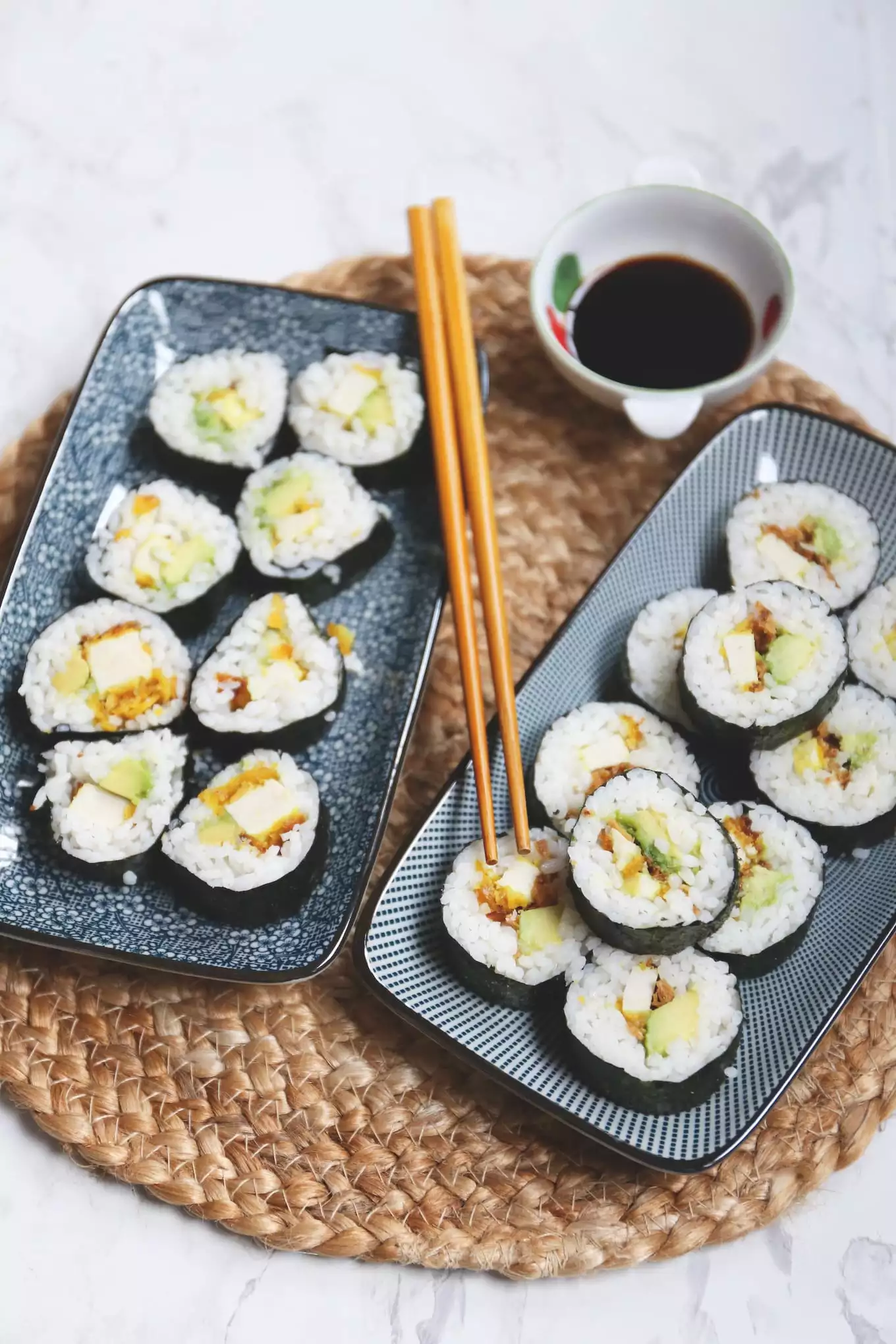 Snijd alle ingrediënten in reepjes. Je kunt vervolgens de sushi maken met behulp van een bamboe matje. Wij hebben op deze manier ook een paar keer sushi gemaakt. Leg een norivel met de glimmende kant naar beneden op een bamboe matje. Bedek ongeveer 2/3 van het norivel met sushirijst. Zorg ervoor dat aan de bovenkant geen rijst zit, alleen aan de onderkant. De sushirijst plak je met je natte handen op het norivel. Druk dit stevig aan. Zorg ervoor dat de sushirijst niet dikker dan 1 cm is. Verdeel wat ingrediënten over de sushirijst, bijvoorbeeld een paar reepjes avocado en wat sesamzaadjes. Lekker met een beetje wasabi en/of sojasaus.